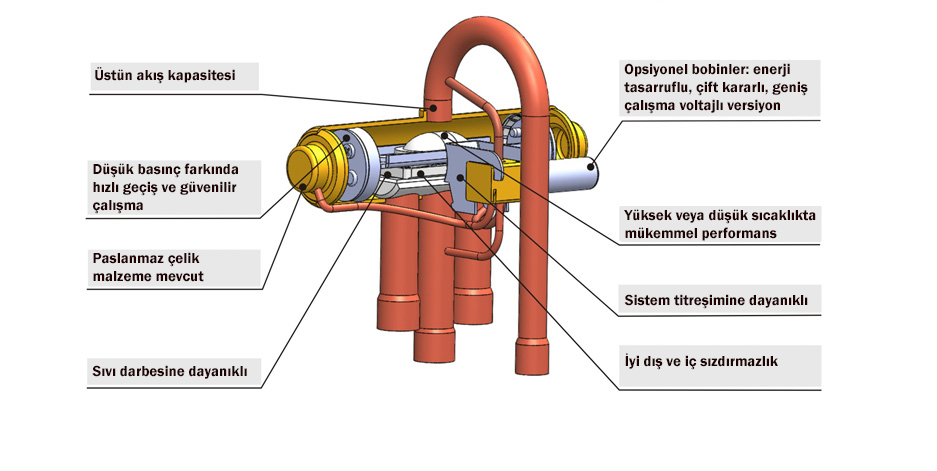 Manyetik 4 yollu ters valf, ısı pompasına uygulanabilir. Soğutucu akışkan akış yolunu değiştirerek modu soğutma, ısıtma ve buz çözme arasında değiştirir.